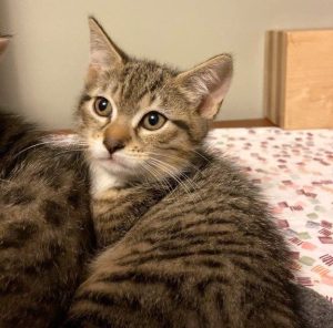 Minerva was the last kitten born in her litter and she is the smallest and most is the youngest and smallest and most quiet. She is a bit hesitant, and takes some time to think about things that her siblings may rush into. Although she often likes to be a watcher, during play time she plays just a hard as the others. Mini can be a bit shy and it takes her a while to warm up to new people. She doesn’t like to approach them, but is working to become a bit more brave. She is very sweet and cute but is learning how to be more confident and cuddly. We would really like to see Mini get adopted with one of her siblings who can help her brave the world.