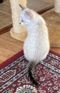 Sprout is a gorgeous kitten with lynx point markings. She turns a lot of heads because of her colours, but also due to her personality. She is always on the go and likes to explore new things. She is very adventurous and is often the first one to try new things. She is her own woman. She has an independent streak and doesn’t like to be bored. She is usually the kitten showing the others how everything is done!