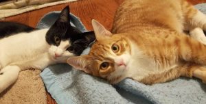 Tuffy (orange) is the more dominant of the two kittens once he’s settled in, but he started out much less brave than his brother and it took a long time for his confidence to build. When he first arrived he would hiss, spit, and strike at his foster mom (out of fear) if she got too close. She spent a long time building his trust and Tuffy is actually quite pushy now and barges his way to the front of the line to get attention. He is now the more forward and friendly of the two kittens and really just craves attention. Like his brother, he does sometimes give love-nips when he gets over-stimulated during a cuddle session. Tuffy will purr, and rub, and roll around to get attention but every few pets he gets a bit over-stimulated and he will nip at his foster mom. She will take a very brief time out from petting him and then go right back to it until Tuffy starts to get over-stimulated again. He is learning quickly and does understand the word ‘no’ but it’s important for his new owner to have a good handle on how to read Tuffy’s body language and have experience working with under-socialized cats. These two boys are food motivated, which makes them a bit easier to work with.